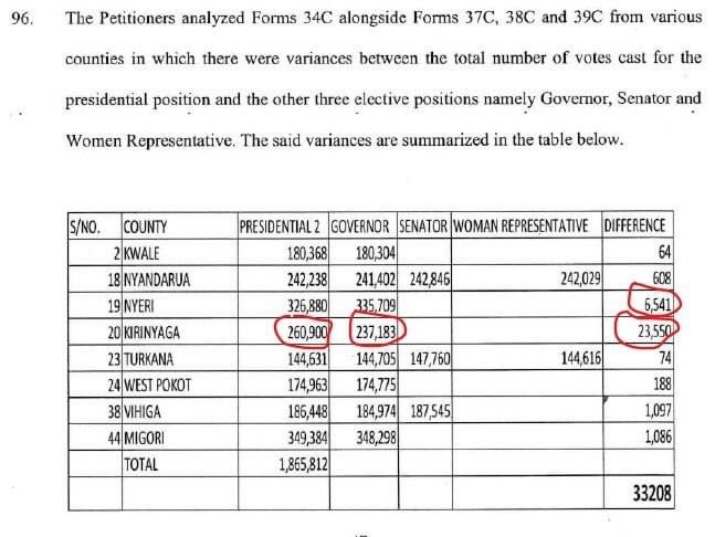 These are the numbers according to Azimio, Kirinyaga County alone is responsible for 70% of the variance, a little digging reveals total votes cast in the gubernatorial contest was 261,823 not 237,183 which reduces the claimed total variance to 8568, dash over to the Nyeri column, their governor election results does not include rejected votes, once those are added the variance will reduce further.
